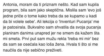 Možeš osjetiti ogromno olakšanje već u prvom tjednu, onog trena kad napraviš vježbu "Dijagnoza" i napokon shvatiš zašto radiš to što radiš i da nisi "slomljena". Lekcije su dizajnirane za duboku, ali postepenu primjenu. Cilj je da već unutar prvih tjedana programa definiraš i napraviš svoj prvi "mali korak" brige o sebi.