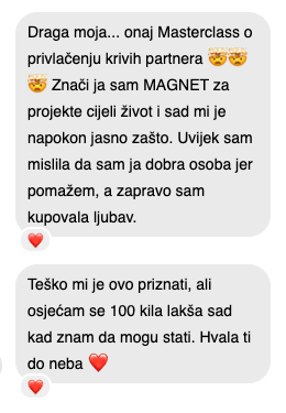 Apsolutno. To je u srži ovog programa. Učimo te da je jedini način da prestaneš privlačiti ljude koji te ne vide taj da ti prva počneš "viđati" sebe. Kroz cjeline i posebne bonuse (poput Masterclassa "Kako naši obrasci privlače krive partnere"), duboko zaranjamo u to kako prekinuti ciklus samo-sabotaže u odnosima i postati emocionalno neovisnija.