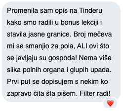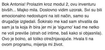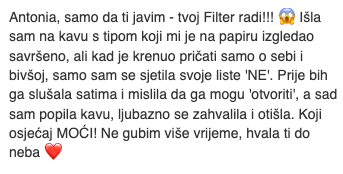 Možeš osjetiti ogromno olakšanje već u prvoj cjelini, kad napravimo vježbu "Inventura Dejtanja" i napokon shvatiš zašto si privlačila krive tipove i da s tobom nije ništa "krivo". Cilj je da do kraja programa imaš spreman i aktivan svoj "Filter", što će ti odmah početi štedjeti tjedne (ili mjesece) gubljenja vremena na krive kandidate u dejtanju.