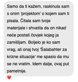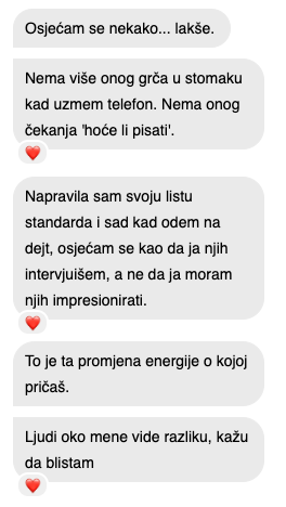 Da! Podržana si mojom 30-dnevnom garancijom zadovoljstva. Ako prođeš kroz prve cjeline, napraviš vježbu "Inventura Dejtanja" i ne osjetiš veću jasnoću oko svojih prošlih izbora ili olakšanje jer napokon imaš plan, samo mi pošalji email unutar 30 dana, i vratit ću ti novac bez problema.
