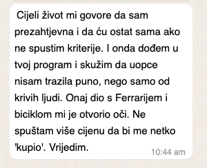 Ovo je najčešći strah žena koje su naučene da se moraju smanjivati i pristajati na mrvice da bi bile voljene. Postoji ogromna razlika između arogancije (koja dolazi iz nesigurnosti i potrebe za kontrolom) i imanja standarda (koji dolaze iz dubokog samopoštovanja). Ovaj program te uči kako komunicirati svoje standarde na način koji je smiren, ženstven i zapravo privlačan kvalitetnim, emocionalno zrelim muškarcima.